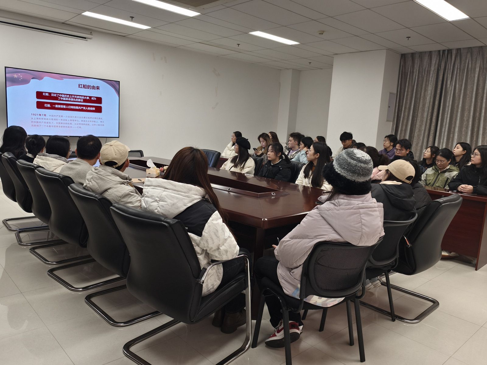 赛前,活动负责人贾玉昕带领学院研究生同学们集体认真学习了“红船精神”。