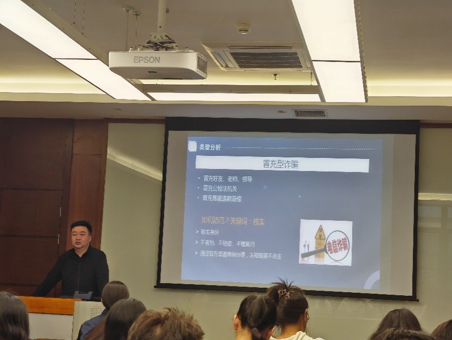 在两场专题讲座中,刘郅祎老师结合自身在保卫处的工作经历,根据本科生、研究生的不同特点,从不同角度作为切入点,向同学们详细讲解了各类常见的诈骗手段和方式,并针对性地讲授了相应的防范措施。他指出,对于网络交友复合型诈骗,请同学们务必保持清醒头脑,拒绝诱惑,不参与非法投资活动;对于冒充型诈骗,请同学们务必通过官方渠道或已知联系方式核实对方身份,不轻易转账或提供个人信息;对于虚拟游戏与刷单返利诈骗,请同学们务必警惕游戏内交易风险,不参与非法刷单活动,选择正规平台进行交易。