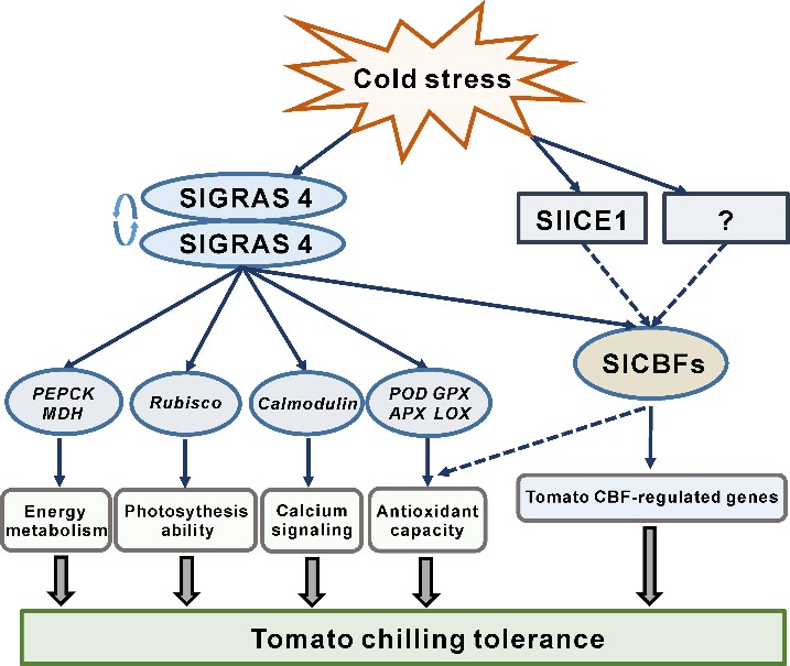 番茄是低温敏感植物,其果实采后的低温贮运往往导致冷害损伤,严重影响果实品质,但目前番茄响应低温胁迫的分子调控机制还不清楚。本研究鉴定了一个受低温显著诱导表达的SlGRAS4转录因子,转基因研究发现能显著提高番茄植株和果实的低温抗性。通过ChIP-seqRNA-seq关联分析鉴定了多个响应低温胁迫的基因受SlGRAS4直接调控,蛋白质互作验证SlGRAS4可以形成同源二聚体并直接激活自身启动子。同时,SlGRAS4还可以直接结合并激活SlCBFs基因的启动子,显著促进SlCBFs转录的同时不影响番茄的正常生长发育。本研究所鉴定的SlGRAS4调控途径是一个新的番茄低温响应途径,相对独立于已知的ICE1-CBF抗冷途径。该研究结果为提高番茄品种抗寒性的分子育种提供了新的途径和思路。
