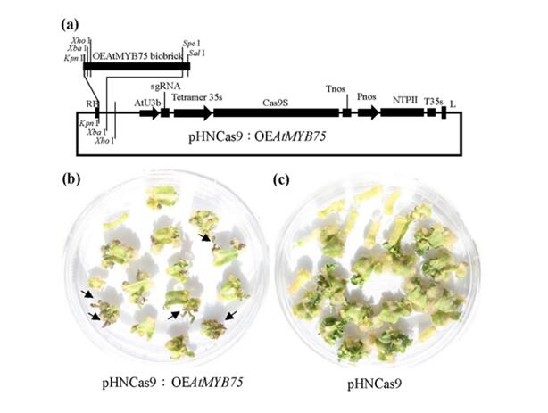 随着植物基因组数据急剧膨胀,但对这些植物基因进行功能解析的工作仍然进展缓慢。因此研发具有潜在高通量特性的CRISPR/Cas9系统对于高通量解析植物基因功能具有重要的潜在意义。然而在植物中进行CRISPR/Cas9系统的高通量应用仍然存在筛选阳性再生苗周期长、工作量大,后期筛选非转基因突变体困难等问题。为了解决这些技术难题,在本研究中创新性的提出了可视化CRISPR/Cas9系统的技术路线(在CRISPR/Cas9系统中添加能够促进花青素积累的生物砖结构)。使用可视化的CRISPR/Cas9系统进行的遗传转化能够在再分化30天内分化出浅紫色再生芽(图3),从而有效提高了基因编辑筛选效率。该研究得到了国家自然科学基金和科技部十三五重点研发计划项目的支持。