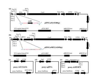 2019年1月,Horticulture Research 在线发表了英国上市公司官网365博士生胡楠为第一作者、李正国为通讯作者的题为“Rapid and user-friendly open-source CRISPR/Cas9 system for single- or multi-siteediting of tomato genome”的研究论文。该研究使用标准化生物砖组装技术设计开发了一种更加开放易升级的、更易用的并适用于高通量操作的植物CRISPR/Cas9系统(图1)。这一系统包括了pHNCas9(多靶位点适用)和pHNCas9HT(单一靶位点高通量构建适用)两个植物表达载体;多个保存有AtU3/AtU6/sgRNA元件的克隆载体。研究人员利用这一系统进行了试剂盒的研发并开发了相应的靶位点特异引物设计软件提高了系统的易用性。